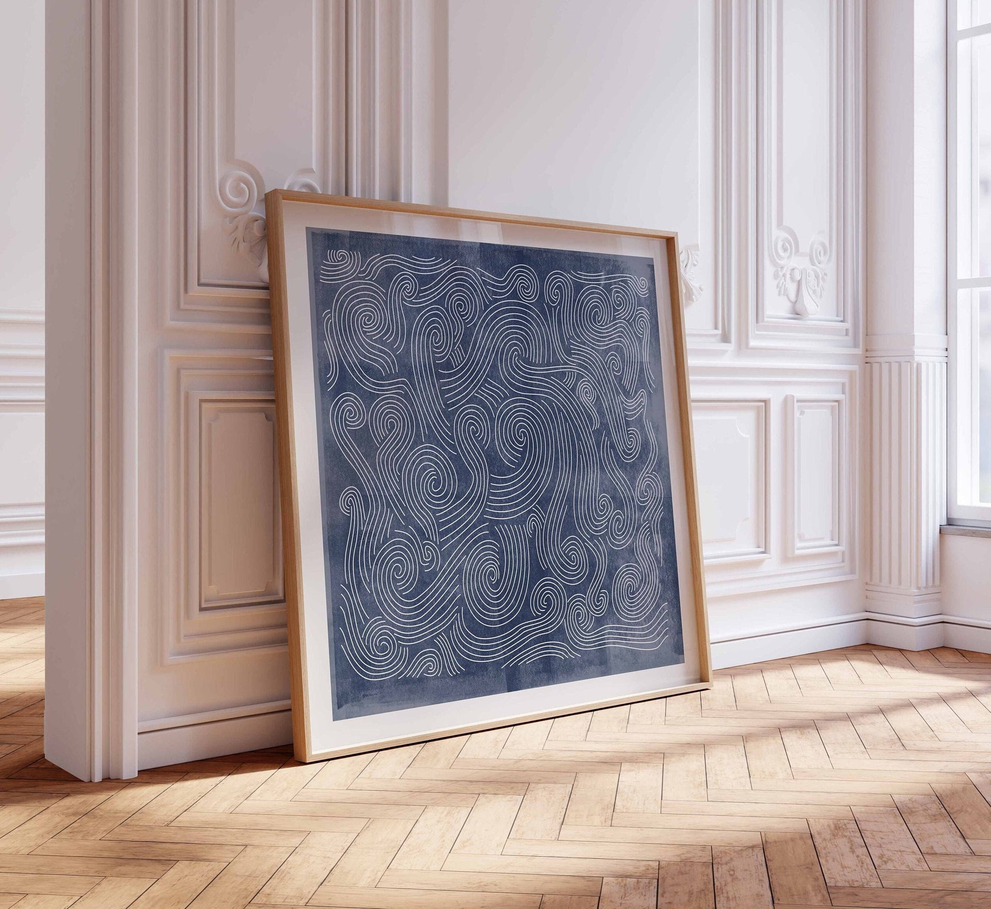 A bold square print with flowing white lines on deep blue. Inspired by waves and wind - perfect for adding calm and movement to your space. Comes with a white border.