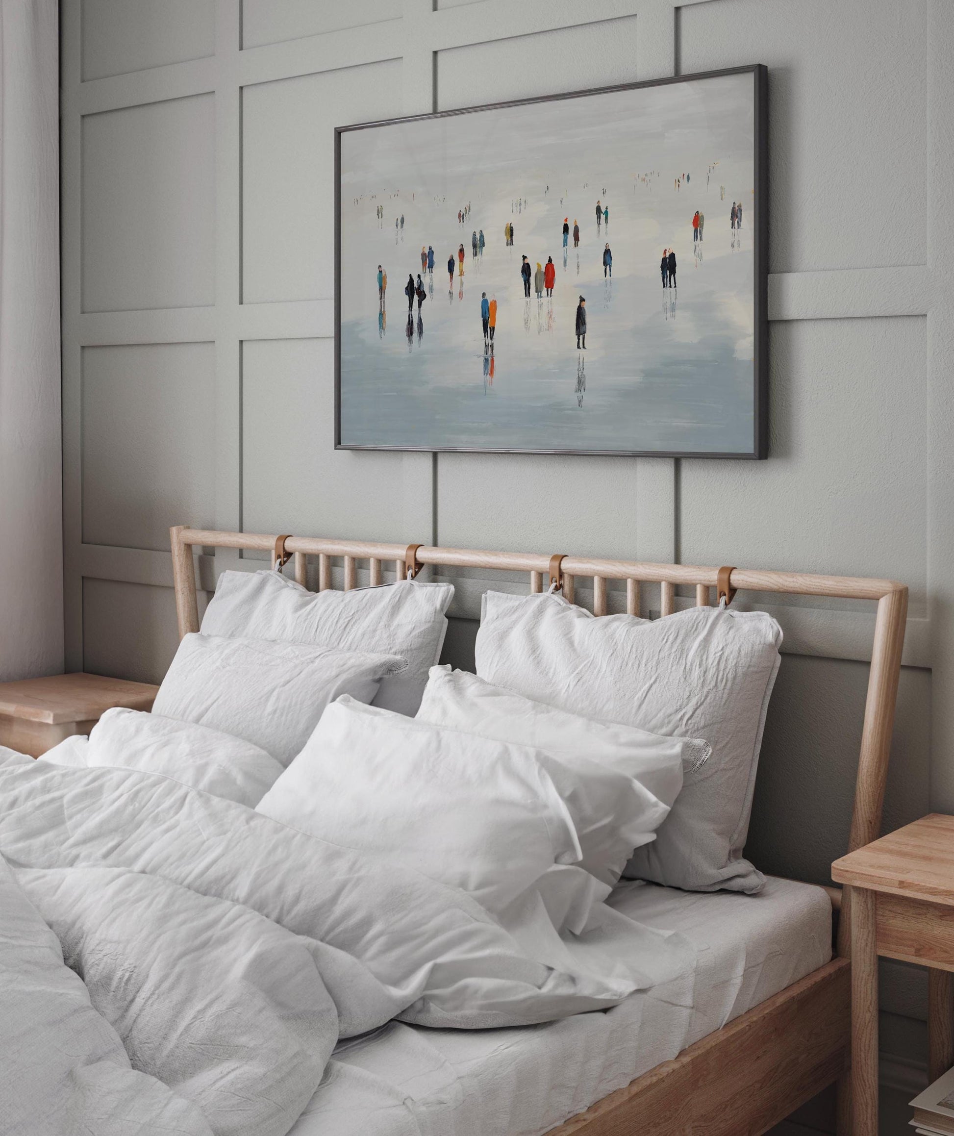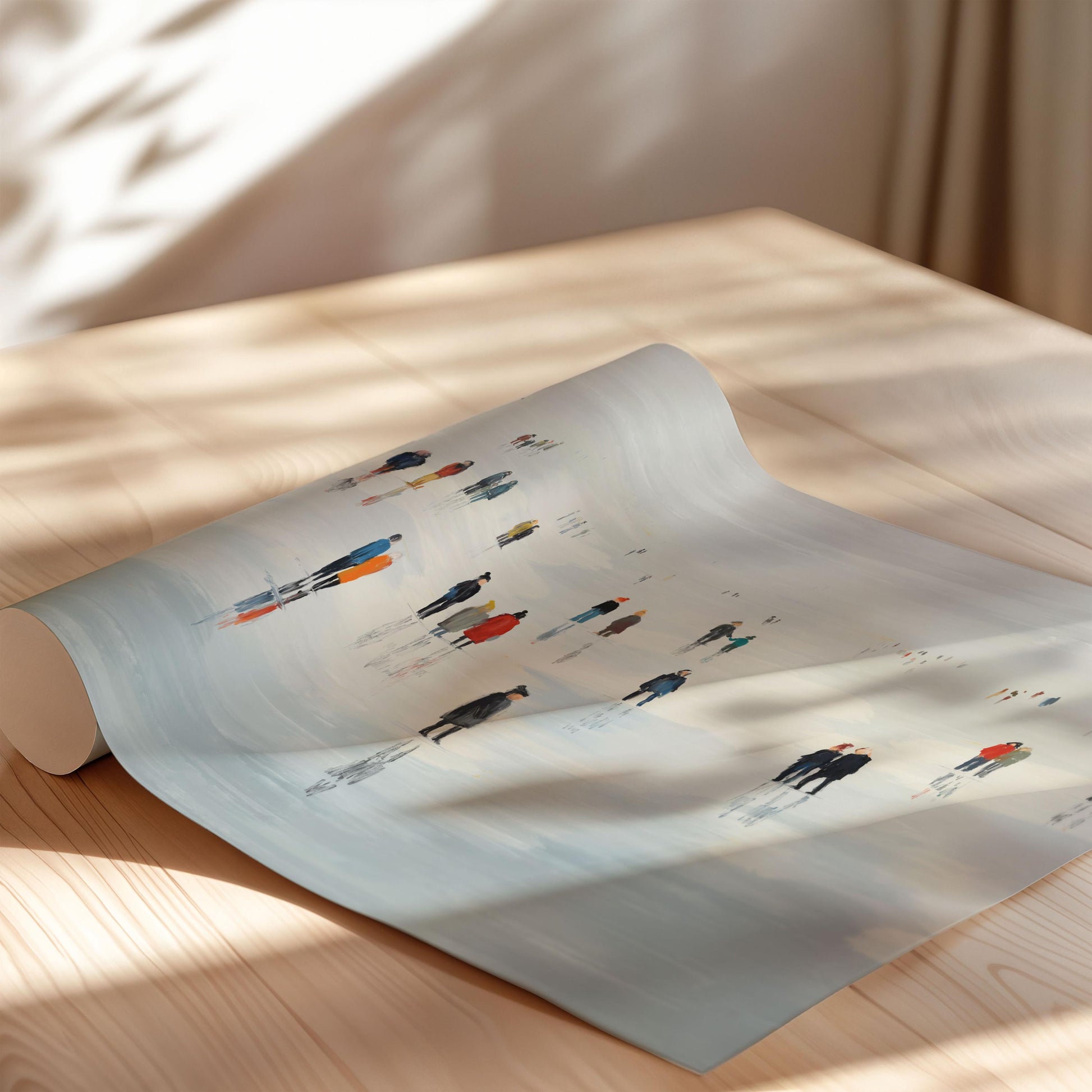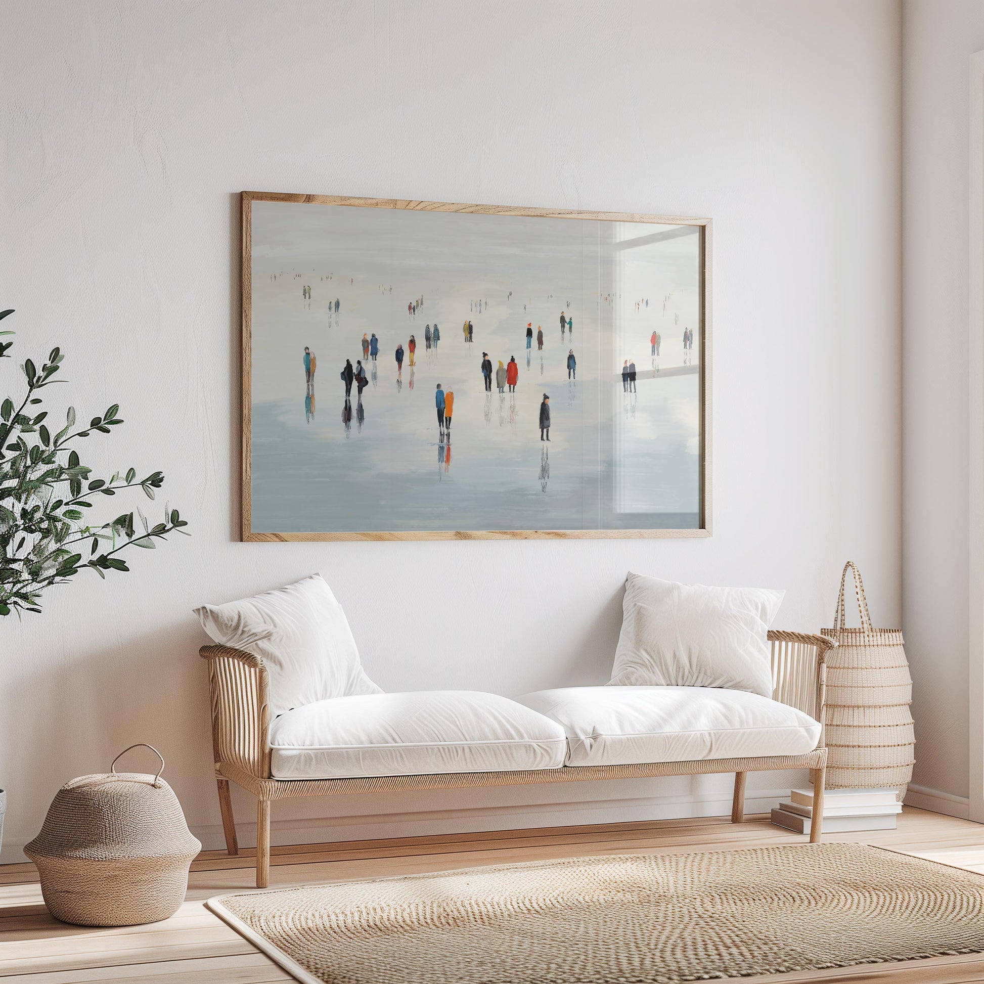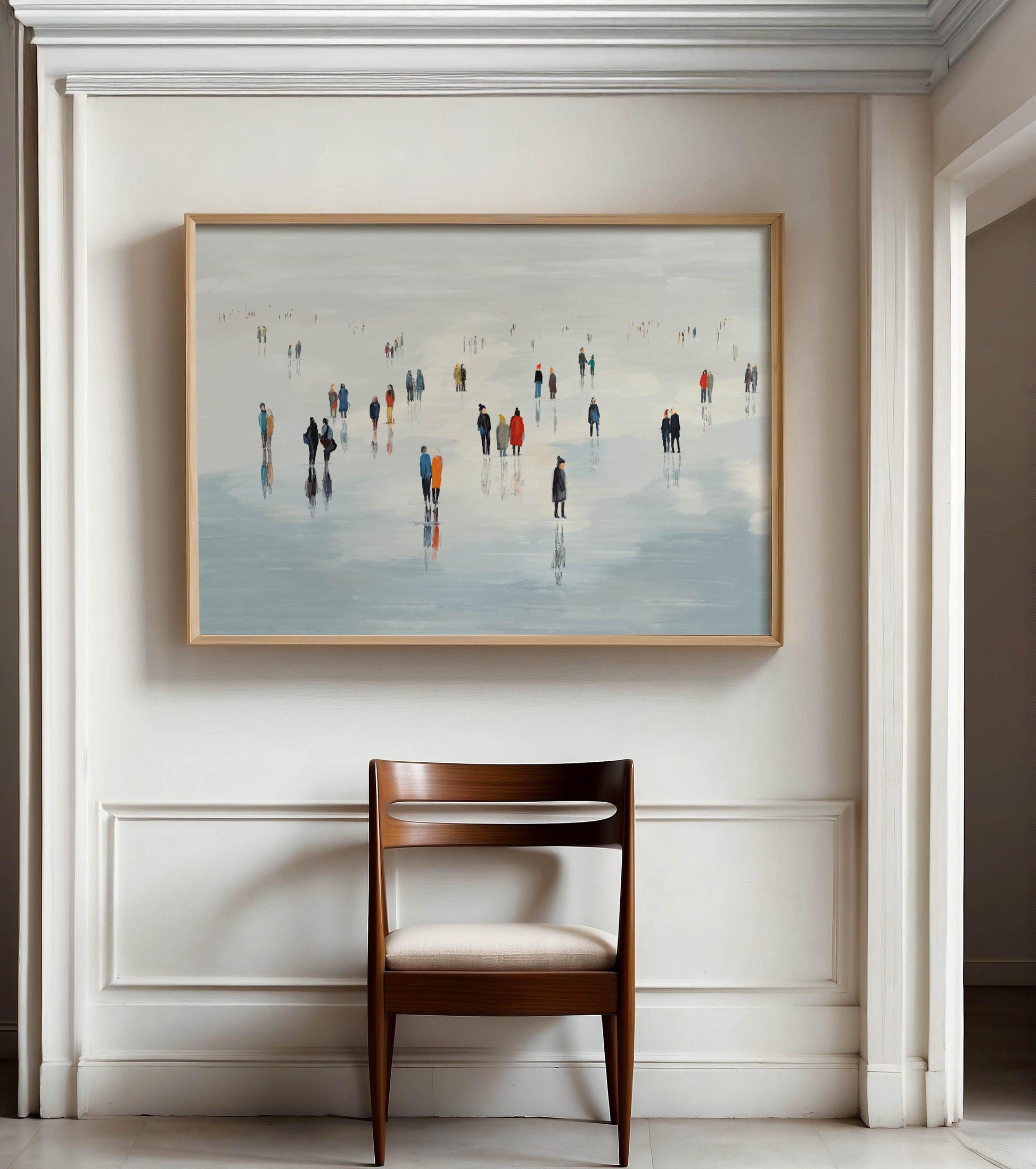 A calm and modern art painting of figures walking across a light beach landscape. Subtle tones with splashes of color create a peaceful, reflective scene. Perfect for a contemporary living room, hallway, or bedroom.