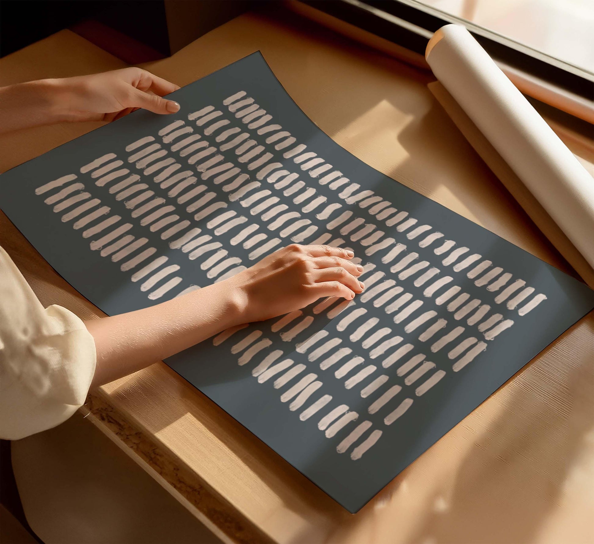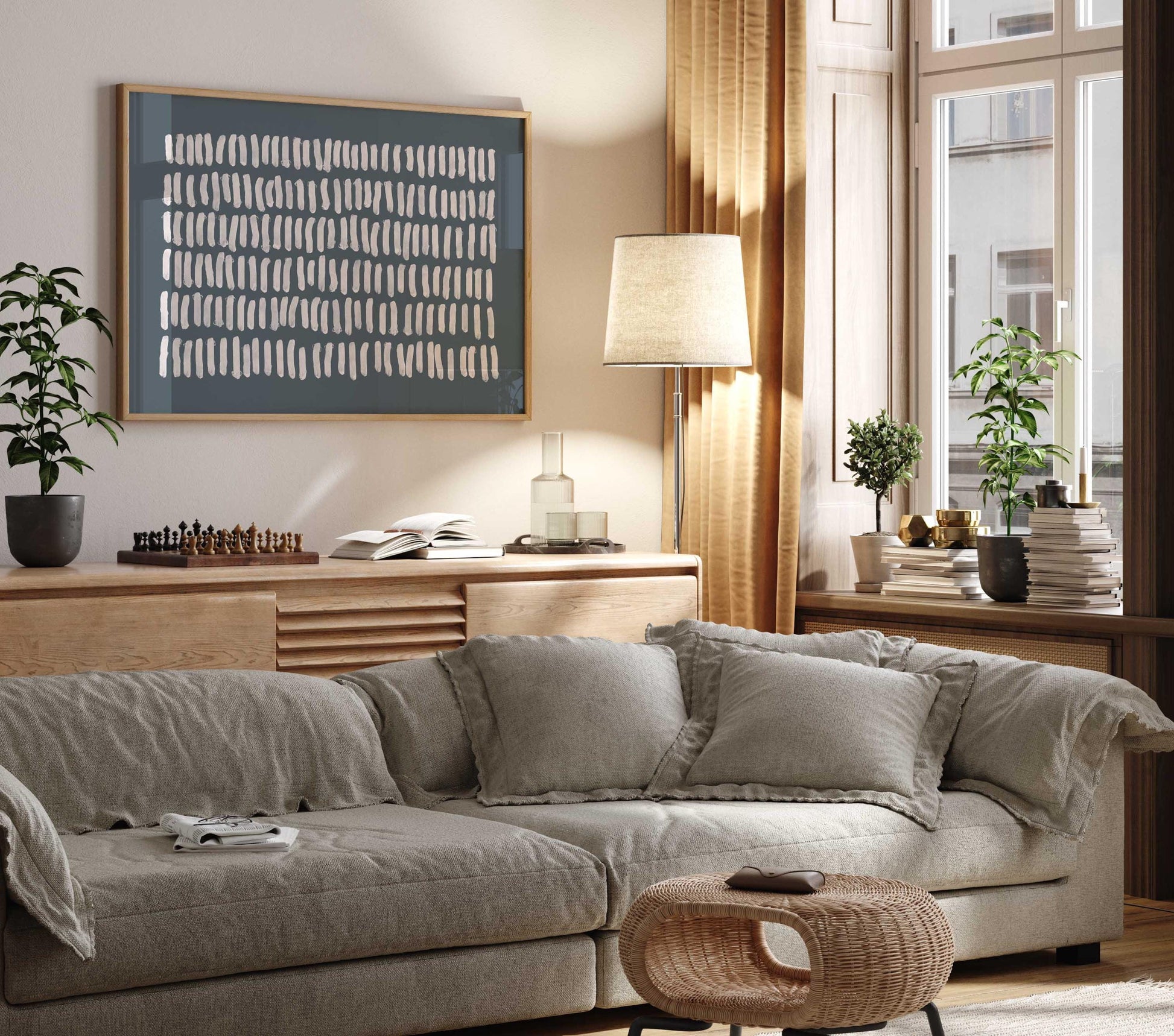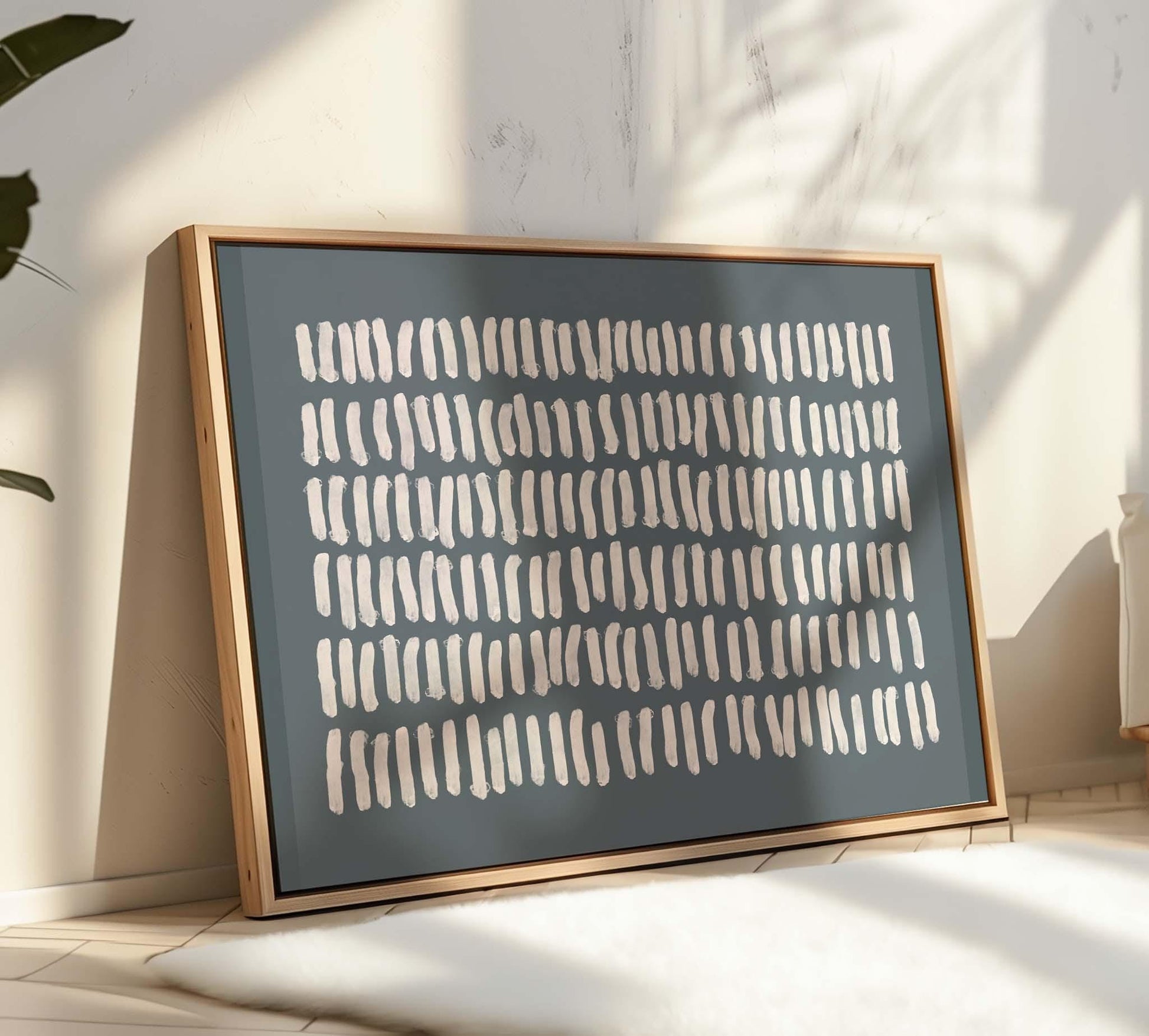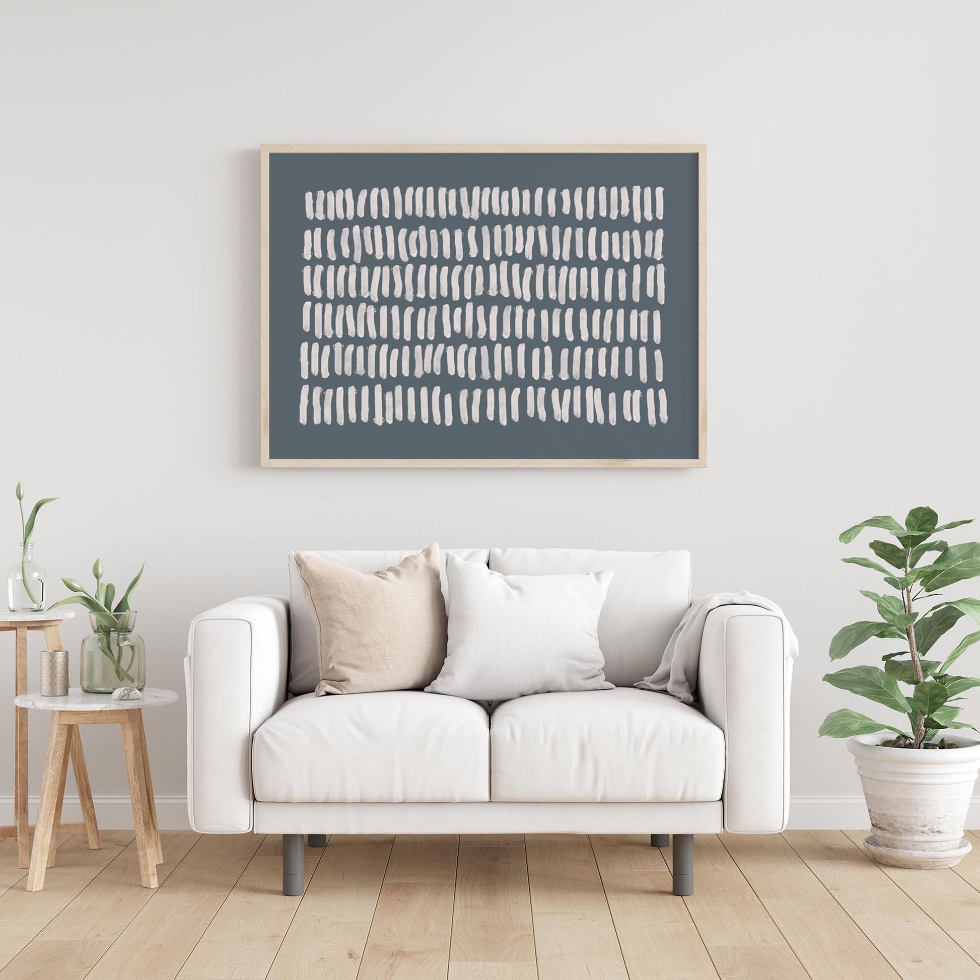 Modern abstract boho print with white brush strokes on deep blue / gray. A calm, minimalist piece perfect for Scandi or Japandi interiors.