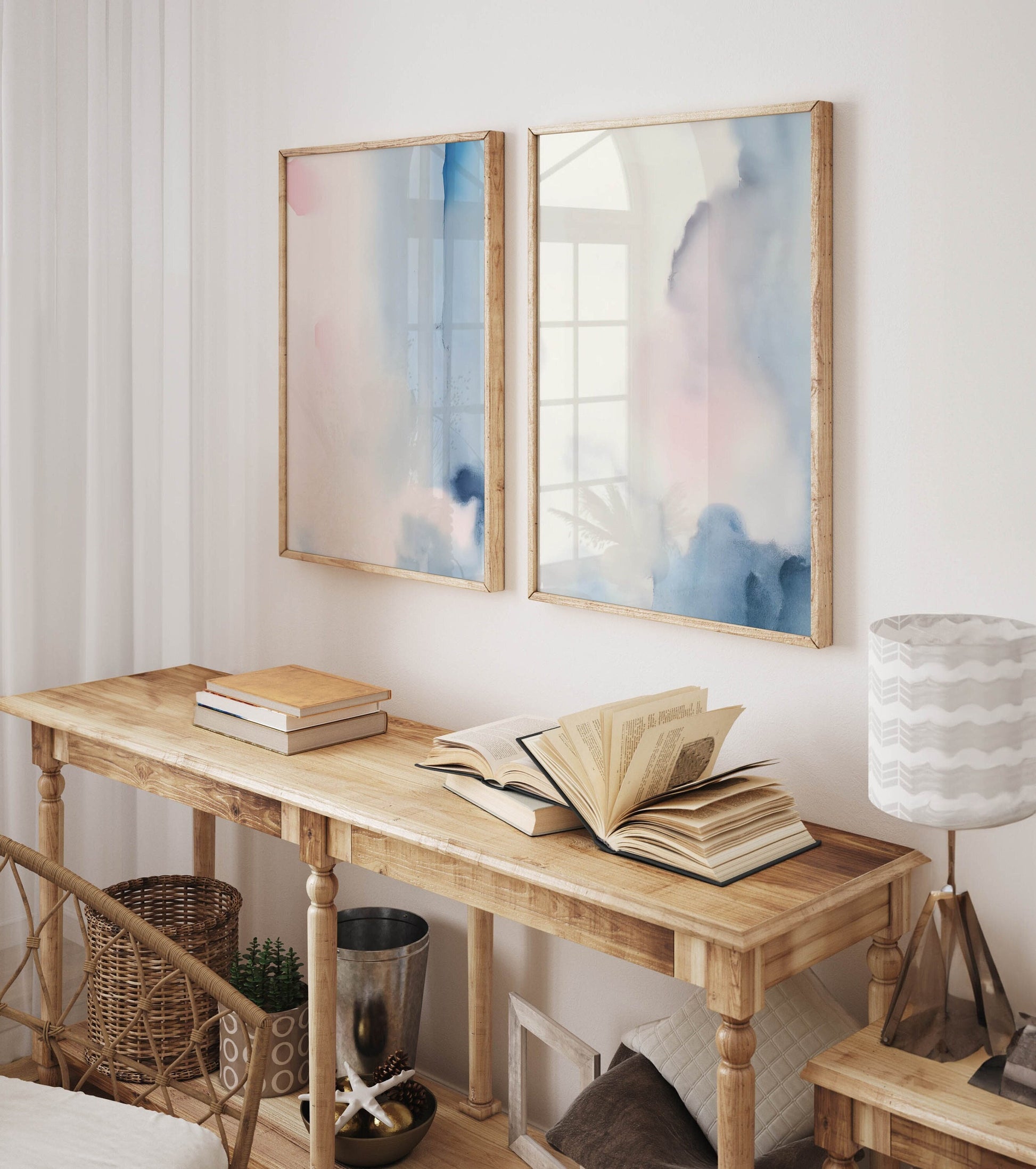 A Gorgeous Blue and Pink Set of 2 Modern Minimalist Watercolor Wash Wall Art Printable Set. This Abstract Art would look good in any location in the home especially in a Modern Living Room or in a Creative Office or Kid's Bedroom.