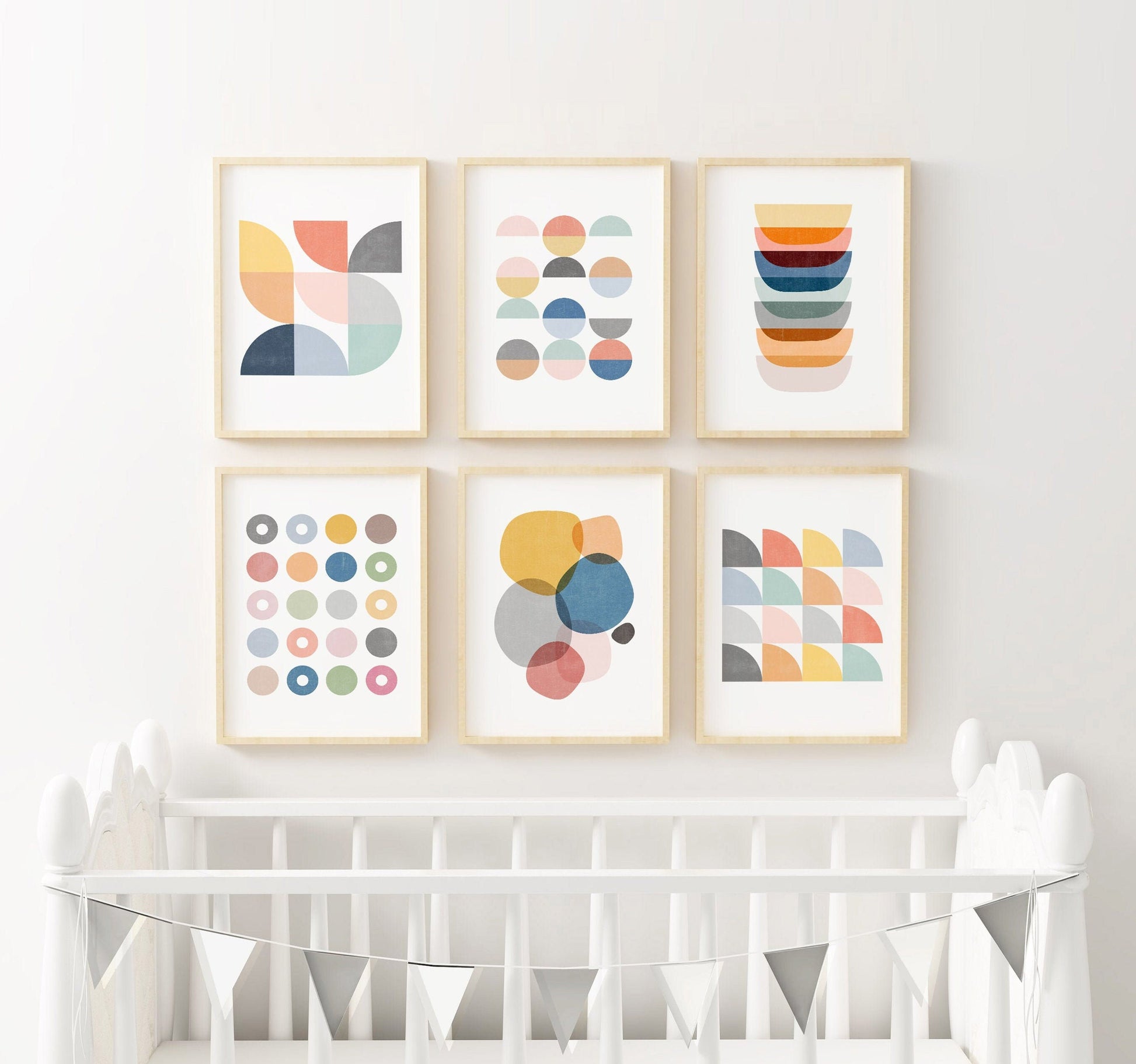 Set of 6 Mid Century Modern Art Prints featuring Bold Geometric Designs and a Vibrant Scandinavian-inspired color palette. Perfect for nurseries or modern interiors. Comes with a light texture.